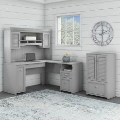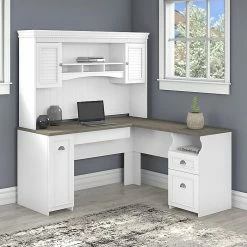 Bush Furniture Fairview 60″ L-Shaped Desk With Hutch, Shiplap Gray/Pure White (FV004G2W)