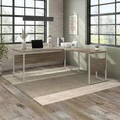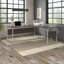 Bush Business Furniture Hybrid 60″W L-Shaped Table Desk With Metal Legs, Modern Hickory (HYB027MH)