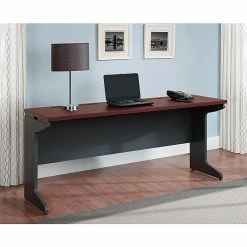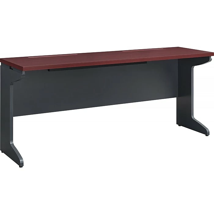 Add a workspace anywhere with the commercial grade Ameriwood Home Pursuit Credenza. Whether you need a desk in your home office or an extra workstation in your conference room, the credenza’s minimalist design will fit effortlessly. It has a wide desktop, creating a larger work surface, slim shaped side panels for easy leg movement and a wire management trough and slots to keep cords organized. The subtle curves and beautiful cherry and gray finish also give the credenza a refined elegance that’ll enhance the style of any room. When assembled, the credenza has dimensions of 29.5”h x 66”w x 19.5”d. It’s made of water-resistant PVC with a laminated hollow core for a durable build to last for years.