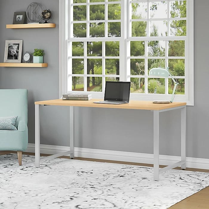 This Bush Business Furniture 400 Series Table Desk inspires creativity with a sturdy construction and refreshingly contemporary looks. The Table Desk mixes open metal legs with a wide, wooden work surface, providing space to spread out and ample legroom. Sturdy Desk legs boast a welded steel tube construction, while the thermally fused laminate finish and impact resistant edges fend off damage for a long-lasting professional appearance. Adjustable levelers compensate for uneven flooring. This Table Desk with metal legs makes a nice addition to a private or home office, but also works well in an open plan environment. Backed by a Limited Lifetime Warranty, this commercial office furniture meets ANSI/BIFMA quality test standards. See the full collection for coordinating items available and design your workspace your way with the 400 Series. American made with U.S. and imported parts.