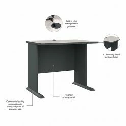 Small but strong, the Bush Business Furniture Cubix 36W Desk fits in tight spaces and endures years of everyday use. Thick end panels and a durable thermally fused laminate surface fend off scratches, stains and dents for long-lasting professional quality. The comfortable C-Leg design offers loads of legroom, while wire management grommets organize and secure computer cables to keep them out of your way. Sturdy Desk feet include encapsulated steel armature and adjustable levelers for use on all types of flooring. Cubix offers a variety of layout options and multiple two-tone finishes. Backed by a 10 Year Warranty. American made with U.S. and imported parts.