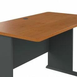 The Bush Business Furniture Cubix 48W Desk provides lasting comfort and durability in a compact package. Perfect for a small office or as part of a larger workspace, the commercial-grade Desk features an open C-Leg design to maximize legroom. Thick end panels resist damage, while a thermally fused laminate surface fends off scratches and stains for a long-lasting professional appearance. Wire management grommets organize and secure computer cables to keep them out of your way. Sturdy Desk feet include encapsulated steel armature and adjustable levelers for use on all types of flooring. Cubix offers a variety of layout options and multiple two-tone finishes. Backed by a 10 Year Warranty. American made with U.S. and imported parts.