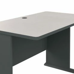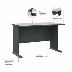 The Bush Business Furniture Cubix 48W Desk provides lasting comfort and durability in a compact package. Perfect for a small office or as part of a larger workspace, the commercial-grade Desk features an open C-Leg design to maximize legroom. Thick end panels resist damage, while a thermally fused laminate surface fends off scratches and stains for a long-lasting professional appearance. Wire management grommets organize and secure computer cables to keep them out of your way. Sturdy Desk feet include encapsulated steel armature and adjustable levelers for use on all types of flooring. Cubix offers a variety of layout options and multiple two-tone finishes. Backed by a 10 Year Warranty. American made with U.S. and imported parts.