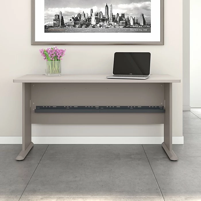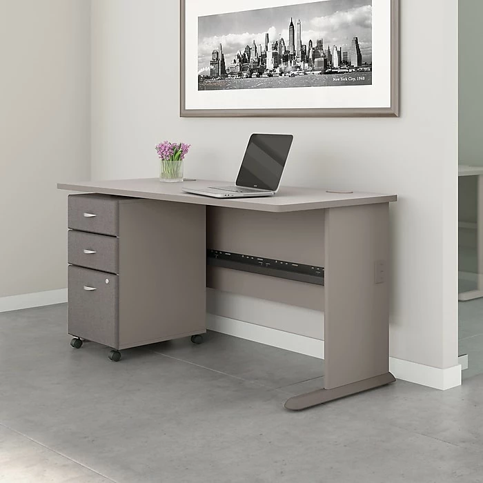 Convenient and comfortable with just the right amount of workspace, the Bush Business Furniture Cubix 60W Desk has the commercial quality you need for years of productivity. The durable thermally fused laminate surface fends off scratches and stains. Rugged edge banding and thick end panels resist damage as sturdy feet with adjustable levelers ensure stability. The comfortable C-leg design offers loads of legroom, and a comprehensive wire management system organizes cables to keep them out of your way. Cubix offers a variety of layout options and 7 attractive two-tone finishes. Backed by a 10 Year Warranty. American made with U.S. and imported parts.