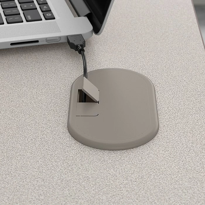 - Wire management system includes leg and desktop grommets with a channel on the modesty panel to keep cables under control