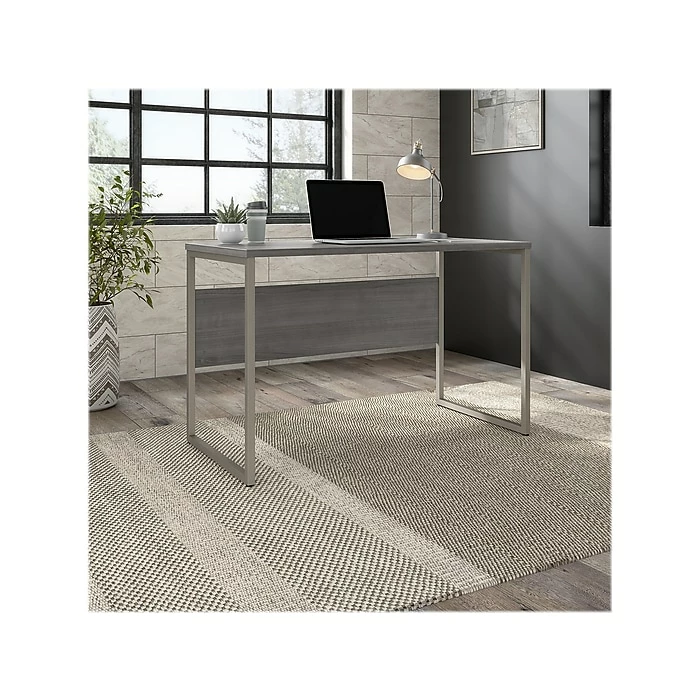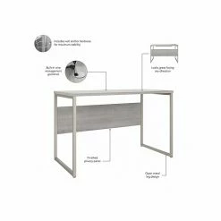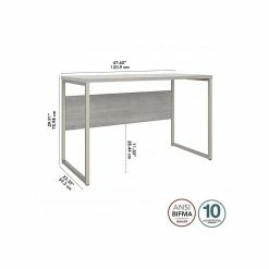 The Bush Business Furniture Hybrid computer table desk blends a durable work surface with sturdy metal legs to offer a stylish, long-lasting solution for the modern professional. Tackle your next project or assignment with a computer, books, paperwork, and more on a desktop that supports up to 200 pounds. A built-in wire management grommet keeps cords and cables in order, so your work area remains free from unnecessary clutter. The computer desk’s open leg design and finished privacy panel allow it to look great facing any direction in a home or professional office environment. Find the perfect look for your space with five contemporary finish options: black walnut, modern hickory, platinum gray, storm gray, and white. This modern desk has been meticulously tested to meet or exceed ANSI/BIFMA quality standards for safety, durability, and performance and is backed by the Bush Business Furniture 10-year manufacturer’s warranty. See the full Hybrid collection for coordinating items to enhance your workspace as needed, including file cabinets, bookcases, and storage cabinets (coordinating items sold separately).