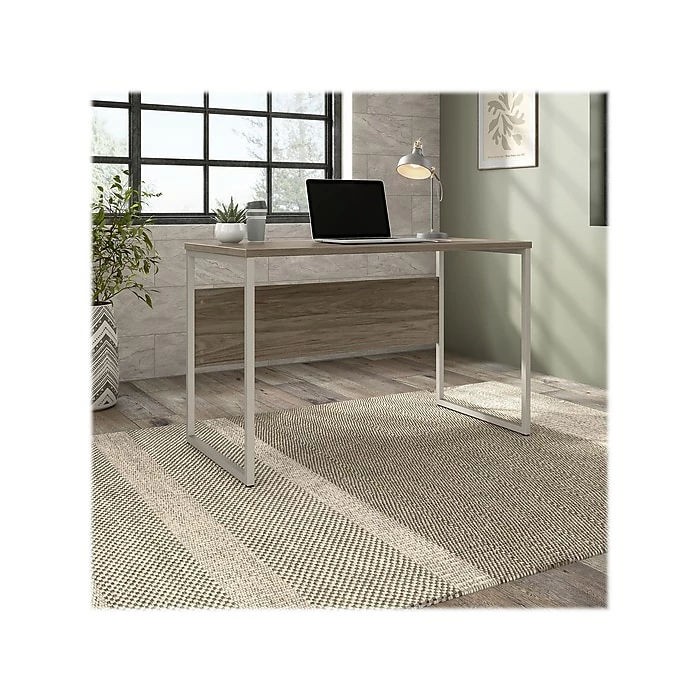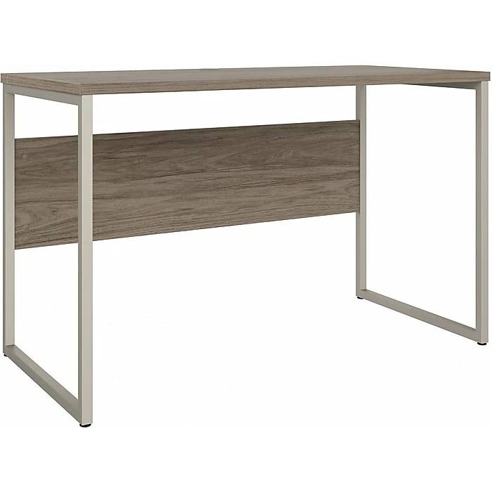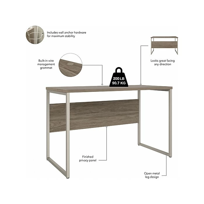 The Bush Business Furniture Hybrid 48″W x 24″D computer table desk blends a durable work surface with sturdy metal legs to offer a stylish, long-lasting solution for the modern professional. Tackle your next project or assignment with a computer, books, paperwork, and more on a desktop that supports up to 200 lbs. A built-in wire management grommet keeps cords and cables in order, so your work area remains free from unnecessary clutter. The computer desk’s open leg design and finished privacy panel allow it to look great facing any direction in a home or professional office environment. Find the perfect look for your space with five contemporary finish options: black walnut, modern hickory, platinum gray, storm gray, and white. This modern desk has been meticulously tested to meet or exceed ANSI/BIFMA quality standards for safety, durability, and performance and is backed by the Bush Business Furniture 10-year manufacturer warranty. See the full Hybrid collection for coordinating items to enhance your workspace as needed, including file cabinets, bookcases, and storage cabinets (coordinating items sold separately). American-made with US and imported parts.