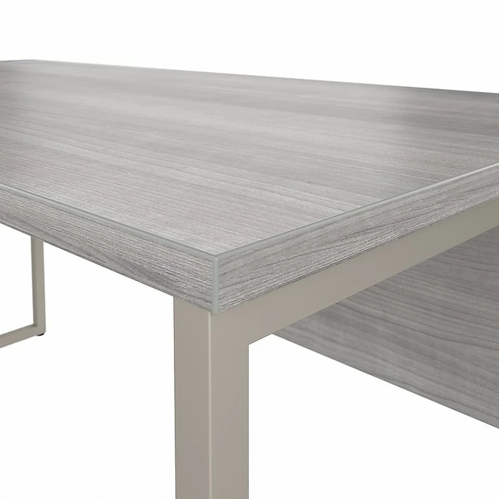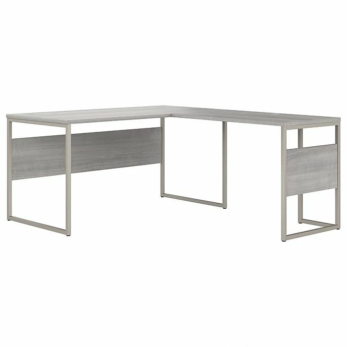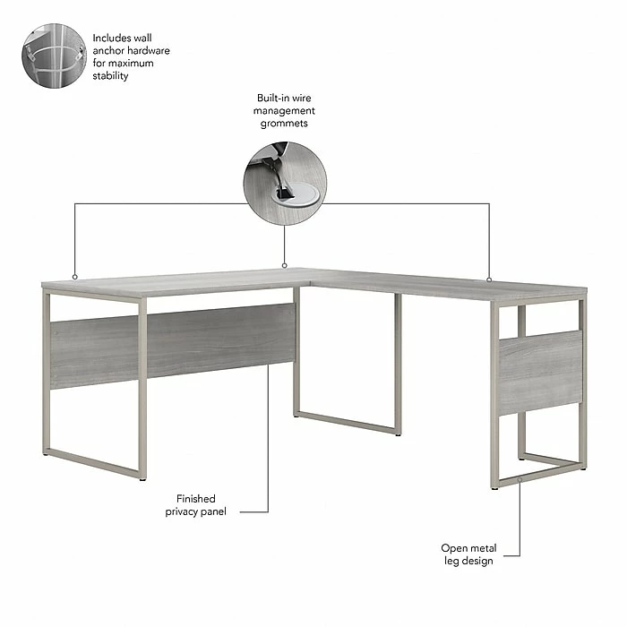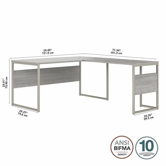 The Bush Business Furniture Hybrid L-shaped table desk blends a durable work surface with sturdy metal legs to offer a stylish, long-lasting solution for the modern professional. Tackle your next project or assignment with a computer, books, and more on a desktop that supports up to 200 lbs. Three built-in wire management grommets keep cords and cables in order, so your work area remains free from unnecessary clutter. The corner desk’s open leg design and finished privacy panel allows it to look great facing any direction in a home or professional office environment. This modern computer desk has been meticulously tested to meet or exceed the ANSI/BIFMA standards for safety, durability, and performance and is backed by a 10-year manufacturer warranty. American-made with US and imported parts.