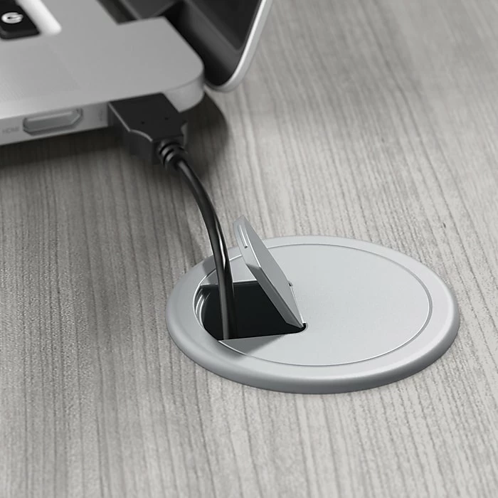 - Desktop includes three built-in wire management grommets to keep cords and cables out of the way