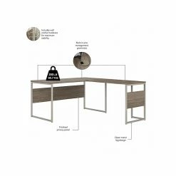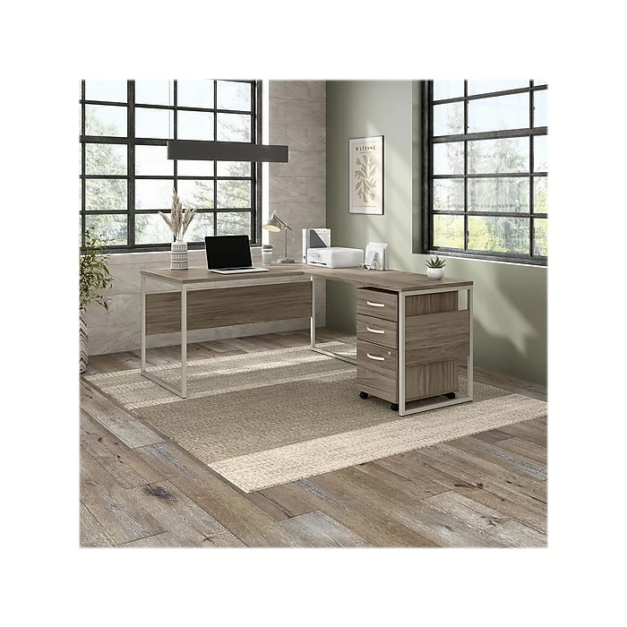 The Bush Business Furniture Hybrid L-shaped table desk with three-drawer mobile file cabinet blends a durable work surface with sturdy metal legs to offer a stylish, long-lasting solution for the modern professional. Tackle your next project or assignment on a desktop that supports up to 200 lbs. and has three built-in wire management grommets to keep cords and cables in order. The corner computer desk’s open leg design and finished privacy panel allow it to look great facing any direction in a home or professional office. The file cabinet’s bottom drawer holds letter-, legal-, and A4-size paperwork, while two box drawers organize supplies. This L-shaped desk with drawers has been meticulously tested to meet or exceed ANSI/BIFMA standards for safety, durability, and performance and is backed by a 10-year manufacturer warranty. American-made with US and imported parts.