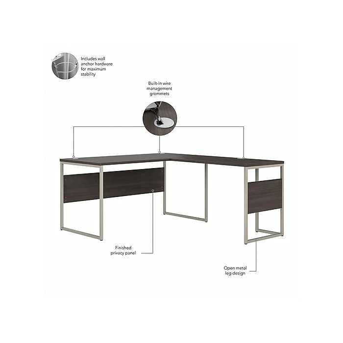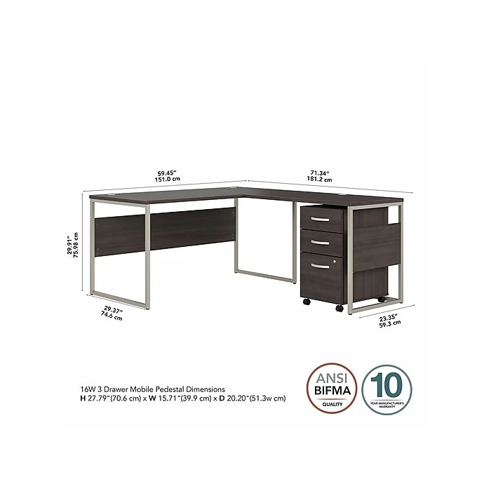 The Bush Business Furniture Hybrid L-shaped table desk with three-drawer mobile file cabinet blends a durable work surface with sturdy metal legs to offer a stylish, long-lasting solution for the modern professional. Tackle your next project or assignment on a desktop that supports up to 200 lbs. and has three built-in wire management grommets to keep cords and cables in order. The corner computer desk’s open leg design and finished privacy panel allow it to look great facing any direction in a home or professional office. The file cabinet’s bottom drawer holds letter-, legal-, and A4-size paperwork, while two box drawers organize supplies. This L-shaped desk with drawers has been meticulously tested to meet or exceed ANSI/BIFMA standards for safety, durability, and performance and is backed by a 10-year manufacturer warranty. American-made with US and imported parts.