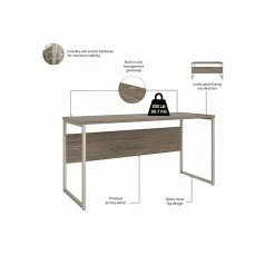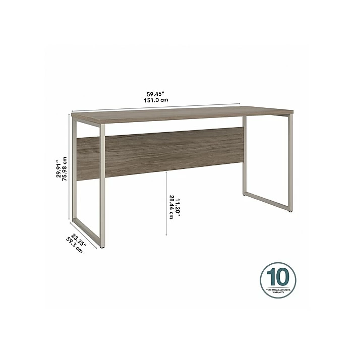 The Bush Business Furniture Hybrid 60″W x 24″D computer table desk blends a durable work surface with sturdy metal legs to offer a stylish, long-lasting solution for the modern professional. Tackle your next project or assignment with a computer, books, and more on a desktop that supports up to 200 lbs. Two built-in wire management grommets keep cords and cables in order, so your work area remains free from unnecessary clutter. The computer desk’s open leg design and finished privacy panel allow it to look great facing any direction in a home or professional office. Find the perfect look for your space with five finish options: black walnut, modern hickory, platinum gray, storm gray, and white. This modern desk has been meticulously tested to meet or exceed ANSI/BIFMA quality standards for safety, durability, and performance and is backed by the Bush Business Furniture 10-year manufacturer warranty. See the full Hybrid collection for coordinating items to enhance your workspace as needed, including bookcases, lateral file cabinets, and storage cabinets (coordinating items sold separately). American-made with US and imported parts.