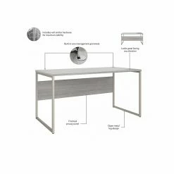 The Bush Business Furniture Hybrid 60″W x 30″D computer table desk blends a durable work surface with sturdy metal legs to offer a stylish, long-lasting solution for the modern professional. Tackle your next project or assignment with a computer, books, paperwork, and more on a desktop that supports up to 200 lbs. Two built-in wire management grommets keep cords and cables in order, so your work area remains free from unnecessary clutter. The computer desk’s open leg design and finished privacy panel allow it to look great facing any direction in a home or professional office environment. Find the perfect look for your space with five contemporary finish options: black walnut, modern hickory, platinum gray, storm gray, and white. This modern desk has been meticulously tested to meet or exceed ANSI/BIFMA quality standards for safety, durability, and performance and is backed by the Bush Business Furniture 10-year manufacturer warranty. See the full Hybrid collection for coordinating items to enhance your workspace as needed, including file cabinets, bookcases, and storage cabinets (coordinating items sold separately). American-made with US and imported parts.