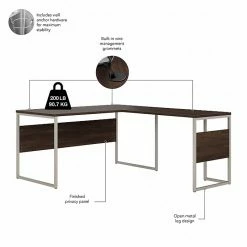 The Bush Business Furniture Hybrid L-shaped table desk blends a durable work surface with sturdy metal legs to offer a stylish, long-lasting solution for the modern professional. Tackle your next project or assignment with a computer, books, and more on a desktop that supports up to 200 lbs. Three built-in wire management grommets keep cords and cables in order, so your work area remains free from unnecessary clutter. The corner desk’s open leg design and finished privacy panel allows it to look great facing any direction in a home or professional office environment. This modern computer desk has been meticulously tested to meet or exceed the ANSI/BIFMA standards for safety, durability, and performance and is backed by a 10-year manufacturer warranty. American-made with US and imported parts.