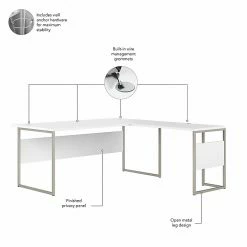 The Bush Business Furniture Hybrid L-shaped table desk blends a durable work surface with sturdy metal legs to offer a stylish, long-lasting solution for the modern professional. Tackle your next project or assignment with a computer, books, and more on a desktop that supports up to 200 lbs. Four built-in wire management grommets keep cords and cables in order, so your work area remains free from unnecessary clutter. The corner desk’s open leg design and finished privacy panel allows it to look great facing any direction in a home or professional office environment. This modern computer desk has been meticulously tested to meet or exceed the ANSI/BIFMA standards for safety, durability, and performance and is backed by a 10-year manufacturer warranty. American-made with US and imported parts.