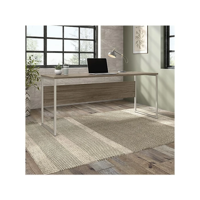 The Bush Business Furniture Hybrid 72″W x 24″D computer table desk blends a durable work surface with sturdy metal legs to offer a stylish, long-lasting solution for the modern professional. Tackle your next project or assignment with a computer, books, paperwork, and more on a desktop that supports up to 200 lbs. Three built-in wire management grommets keep cords and cables in order, so your work area remains free from unnecessary clutter. The computer desk’s open leg design and finished privacy panel allow it to look great facing any direction in a home or professional office environment. Find the perfect look for your space with five contemporary finish options: black walnut, modern hickory, platinum gray, storm gray, and white. This modern desk has been meticulously tested to meet or exceed ANSI/BIFMA quality standards for safety, durability, and performance and is backed by the Bush Business Furniture 10-year manufacturer warranty. See the full Hybrid collection for coordinating items to enhance your workspace as needed, including file cabinets, bookcases, and storage cabinets (coordinating items sold separately). American-made with US and imported parts.