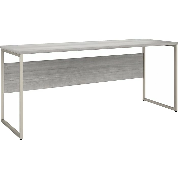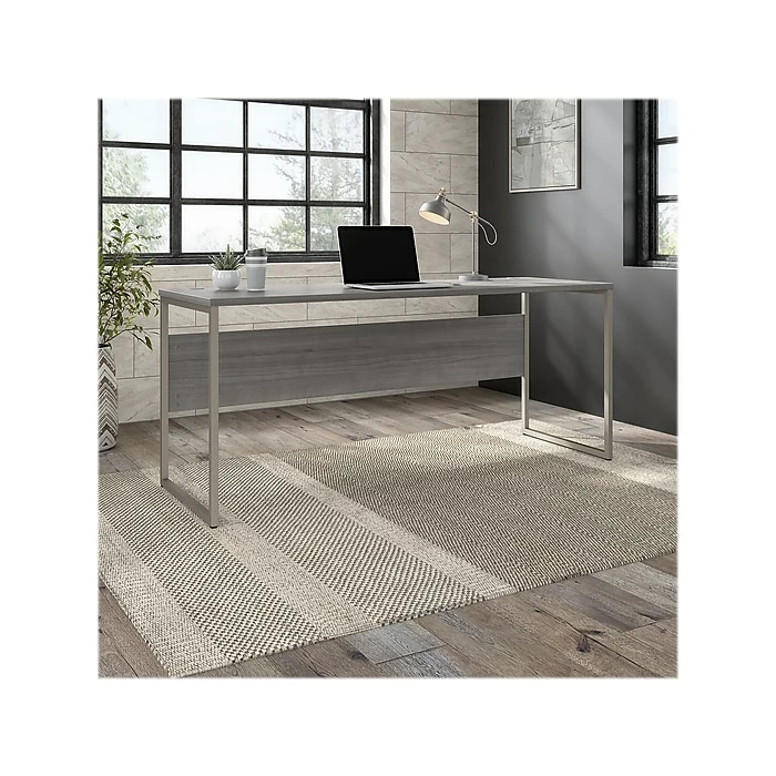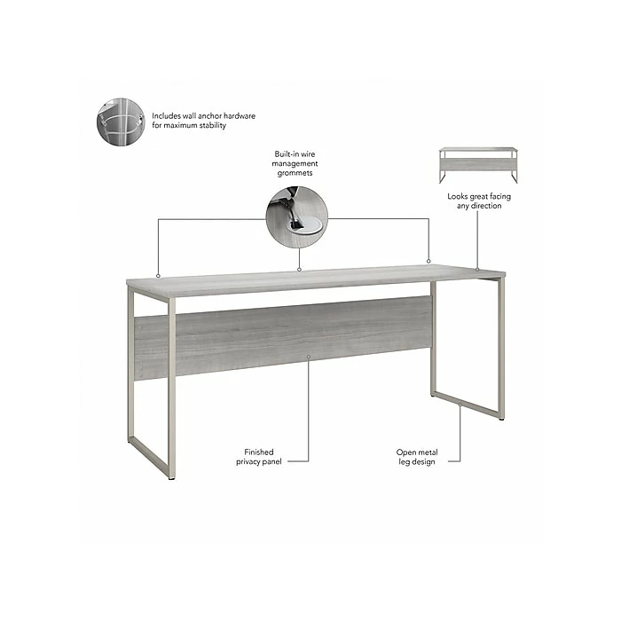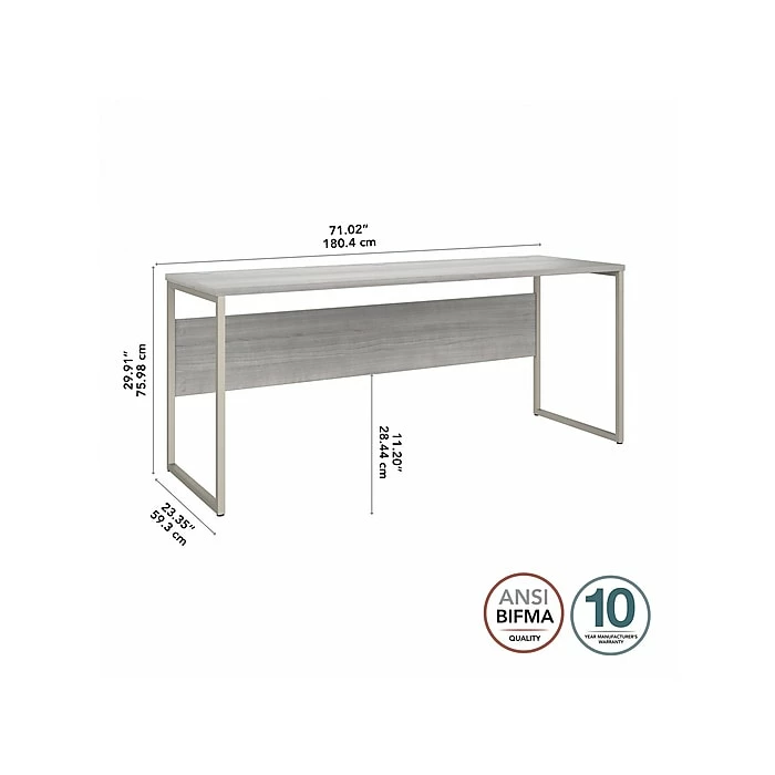 The Bush Business Furniture Hybrid 72″W x 24″D computer table desk blends a durable work surface with sturdy metal legs to offer a stylish, long-lasting solution for the modern professional. Tackle your next project or assignment with a computer, books, paperwork, and more on a desktop that supports up to 200 lbs. Three built-in wire management grommets keep cords and cables in order, so your work area remains free from unnecessary clutter. The computer desk’s open leg design and finished privacy panel allow it to look great facing any direction in a home or professional office environment. Find the perfect look for your space with five contemporary finish options: black walnut, modern hickory, platinum gray, storm gray, and white. This modern desk has been meticulously tested to meet or exceed ANSI/BIFMA quality standards for safety, durability, and performance and is backed by the Bush Business Furniture 10-year manufacturer warranty. See the full Hybrid collection for coordinating items to enhance your workspace as needed, including file cabinets, bookcases, and storage cabinets (coordinating items sold separately). American-made with US and imported parts.