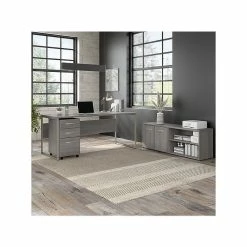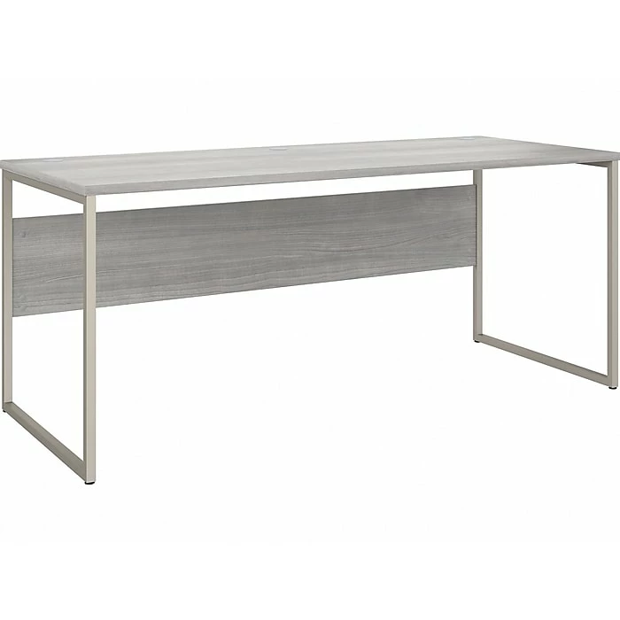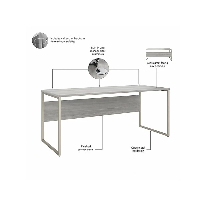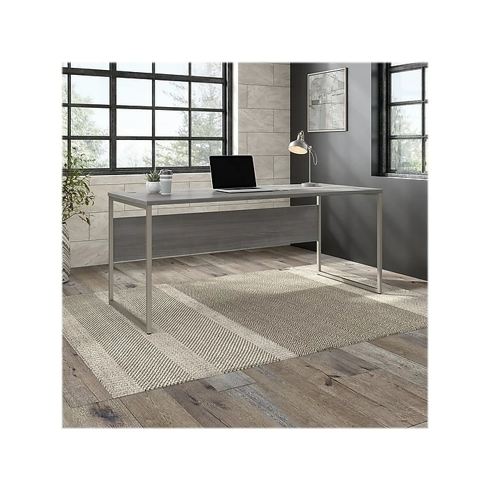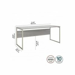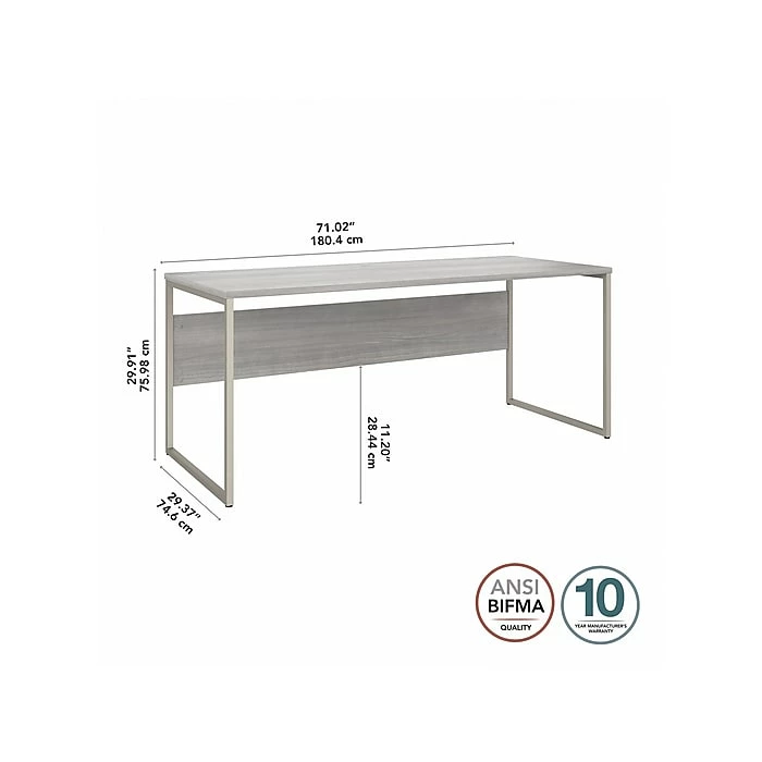 The Bush Business Furniture Hybrid 72″W x 30″D computer table desk blends a durable work surface with sturdy metal legs to offer a stylish, long-lasting solution for the modern professional. Tackle your next project or assignment with a computer, books, paperwork, and more on a desktop that supports up to 200 lbs. A built-in wire management grommet keeps cords and cables in order, so your work area remains free from unnecessary clutter. The computer desk’s open leg design and finished privacy panel allow it to look great facing any direction in a home or professional office environment. Find the perfect look for your space with five contemporary finish options: black walnut, modern hickory, platinum gray, storm gray, and white. This modern desk has been meticulously tested to meet or exceed ANSI/BIFMA quality standards for safety, durability, and performance and is backed by the Bush Business Furniture 10-year manufacturer warranty. See the full Hybrid collection for coordinating items to enhance your workspace as needed, including file cabinets, bookcases, and storage cabinets (coordinating items sold separately). American-made with US and imported parts.