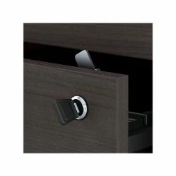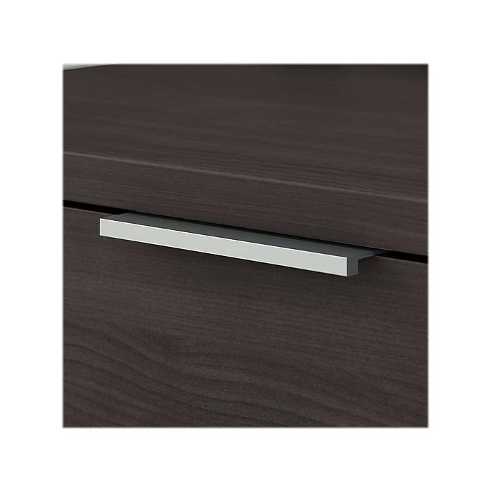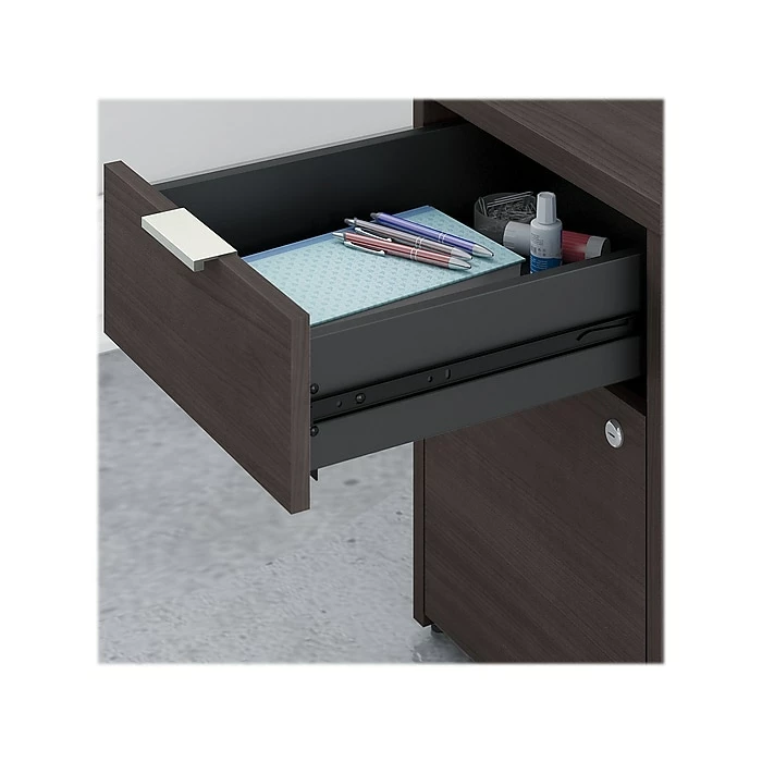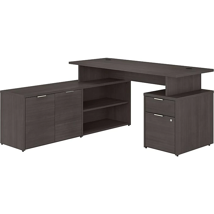 From large corporations to a single-remote workspace, the Bush Business Furniture Jamestown 60″W L-shaped desk with drawers meets the needs of any office. With its contemporary style and an adaptable modular design, this desk is built to meet the ever-changing demands of today’s workplace. The elevated 60″W x 24″D surface accommodates multiple monitors and other equipment with a 200 lb. weight capacity. One side of the computer desk is supported by a 60″W low storage return with open and closed compartments, each of which includes one adjustable shelf for the flexibility to store items of various sizes. On the other side is a two-drawer file cabinet that accepts legal-, letter-, and A4-size paperwork. A single lock secures both of the file cabinet’s drawers to protect sensitive documents and valuable items. This L-shaped desk with storage is tested to meet ANSI/BIFMA standards for safety and performance and is backed by a 10-year manufacturer limited warranty. American-made with US and imported parts.
