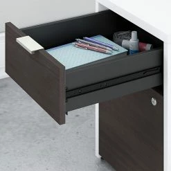 | Included With Bundle | Bundle includes: 71″W desk with a two-drawer file cabinet and low storage return, two-drawer lateral file cabinet, and five-shelf bookcase |