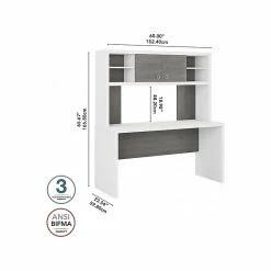 - Modern-style desk and hutch are made of engineered wood in pure white and modern gray laminate finishes