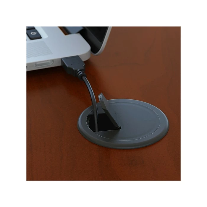 - Feed cables through wire management grommets in the desk surface and modesty panel to keep them out of your way