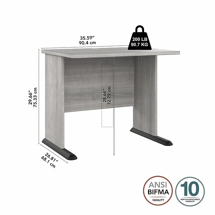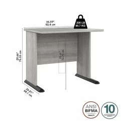 The Bush Business Furniture Studio A 36″W small computer desk combines a fresh contemporary appearance with the commercial-quality construction needed to withstand years of everyday use. A compact surface makes this small desk a perfect choice for working or gaming in areas where space is limited. Set up with a computer and equipment on the durable thermally fused laminate desktop that supports up to 200 lbs. A built-in wire management grommet keeps cords and cables in order, so the surface remains free from unnecessary clutter. Wall attachment hardware is included for maximum safety and security in any home or professional office. This compact desk has been meticulously tested to meet or exceed the ANSI/BIFMA quality standards for safety, durability, and performance and is backed by a 10-year manufacturer warranty. American-made with US and imported parts.