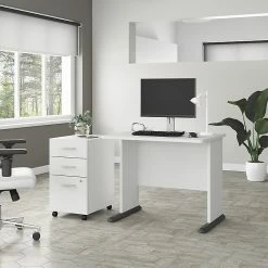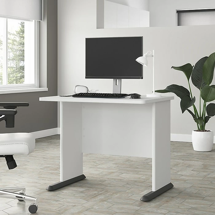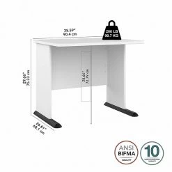 The Bush Business Furniture Studio A 36″W small computer desk combines a fresh contemporary appearance with the commercial-quality construction needed to withstand years of everyday use. A compact surface makes this small desk a perfect choice for working or gaming in areas where space is limited. Set up with a computer and equipment on the durable thermally fused laminate desktop that supports up to 200 lbs. A built-in wire management grommet keeps cords and cables in order, so the surface remains free from unnecessary clutter. Wall attachment hardware is included for maximum safety and security in any home or professional office. This compact desk has been meticulously tested to meet or exceed the ANSI/BIFMA quality standards for safety, durability, and performance and is backed by a 10-year manufacturer warranty. American-made with US and imported parts.