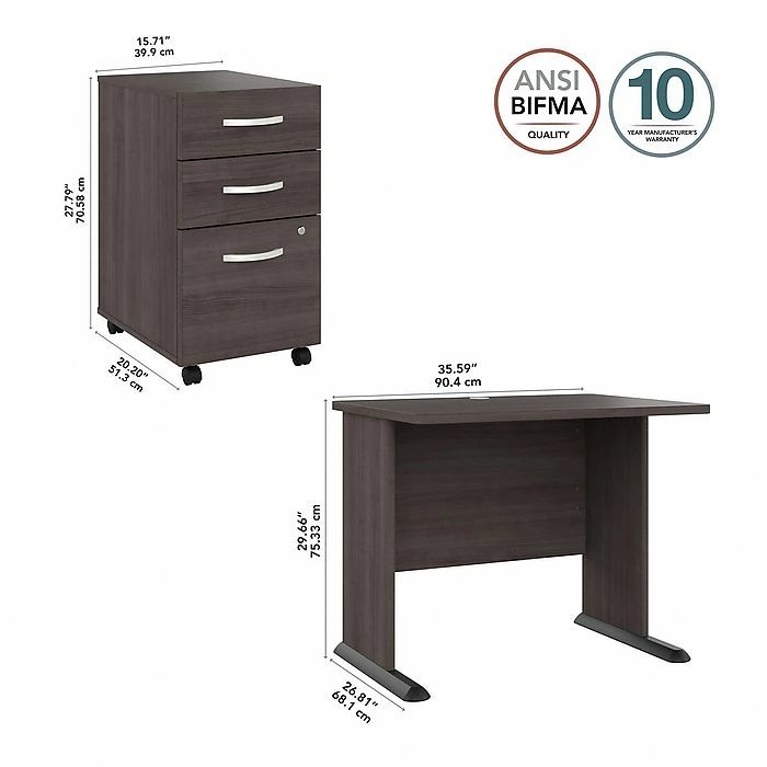 The Bush Business Furniture Studio A 36″W computer desk with three-drawer mobile file cabinet combines a fresh contemporary appearance with the commercial-quality construction needed to withstand years of everyday use. Set up with a computer and equipment on the durable thermally fused laminate desktop that supports up to 200 lbs. A built-in wire management grommet keeps cords and cables in order, so the surface remains free from unnecessary clutter. The file cabinet’s bottom drawer accepts letter-, legal-, and A4-size paperwork, while two box drawers organize supplies. The two bottom drawers can be locked to protect sensitive files and personal items. This small desk with drawers has been meticulously tested to meet or exceed the ANSI/BIFMA standards for safety, durability, and performance and is backed by a 10-year manufacturer limited warranty. American-made with US and imported parts.