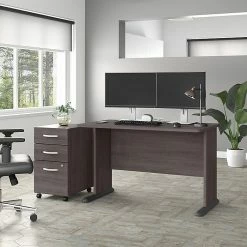 The Bush Business Furniture Studio A 48″W small computer desk combines a fresh contemporary appearance with the commercial-quality construction needed to withstand years of everyday use. A compact surface makes this small desk a perfect choice for working or gaming in areas where space is limited. Set up with a computer and equipment on the durable thermally fused laminate desktop that supports up to 200 lbs. A built-in wire management grommet keeps cords and cables in order, so the surface remains free from unnecessary clutter. Wall attachment hardware is included for maximum safety and security in any home or professional office. This compact desk has been meticulously tested to meet or exceed the ANSI/BIFMA quality standards for safety, durability, and performance and is backed by a 10-year manufacturer warranty. American-made with US and imported parts.