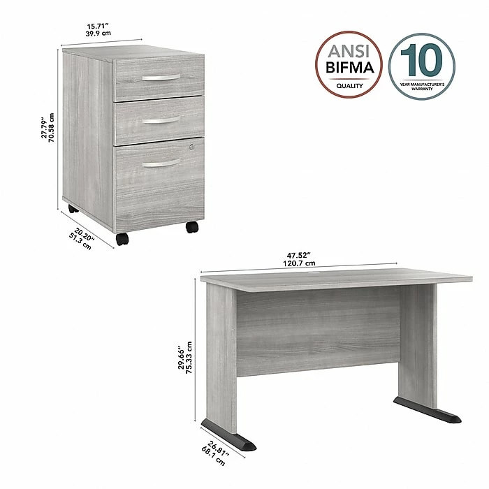 The Bush Business Furniture Studio A 48″W computer desk with three-drawer mobile file cabinet combines a fresh contemporary appearance with the commercial-quality construction needed to withstand years of everyday use. Set up with a computer and equipment on the durable thermally fused laminate desktop that supports up to 200 lbs. A built-in wire management grommet keeps cords and cables in order, so the surface remains free from unnecessary clutter. The file cabinet’s bottom drawer accepts letter-, legal-, and A4-size paperwork, while two box drawers organize supplies. The two bottom drawers can be locked to protect sensitive files and personal items. This small desk with drawers has been meticulously tested to meet or exceed the ANSI/BIFMA standards for safety, durability, and performance and is backed by a 10-year manufacturer limited warranty. American-made with US and imported parts.