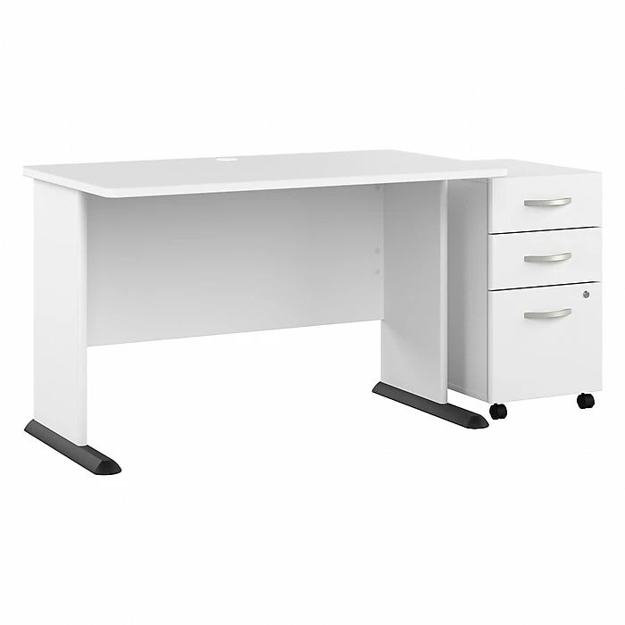 The Bush Business Furniture Studio A 48″W computer desk with three-drawer mobile file cabinet combines a fresh contemporary appearance with the commercial-quality construction needed to withstand years of everyday use. Set up with a computer and equipment on the durable thermally fused laminate desktop that supports up to 200 lbs. A built-in wire management grommet keeps cords and cables in order, so the surface remains free from unnecessary clutter. The file cabinet’s bottom drawer accepts letter-, legal-, and A4-size paperwork, while two box drawers organize supplies. The two bottom drawers can be locked to protect sensitive files and personal items. This small desk with drawers has been meticulously tested to meet or exceed the ANSI/BIFMA standards for safety, durability, and performance and is backed by a 10-year manufacturer limited warranty. American-made with US and imported parts.