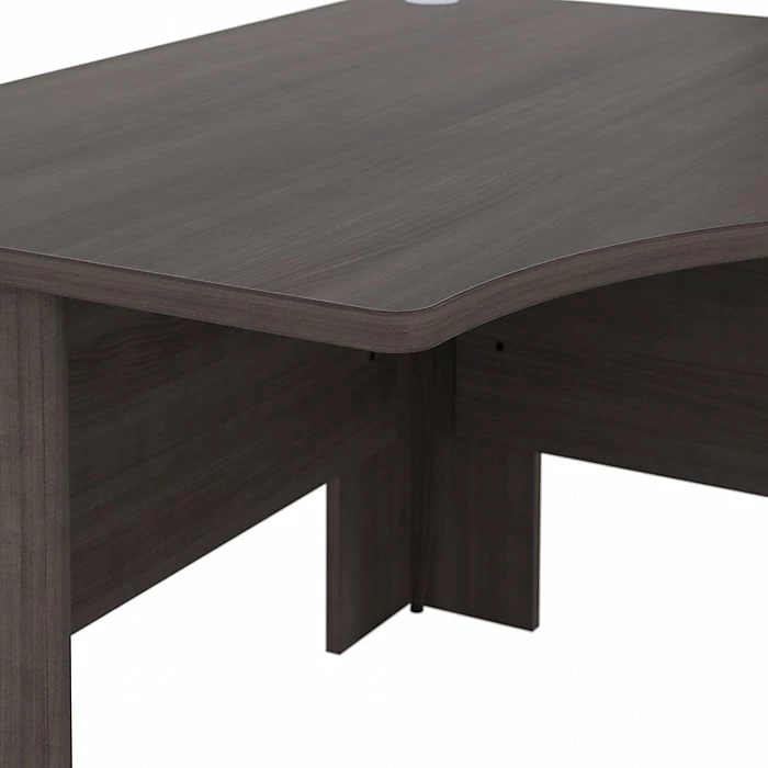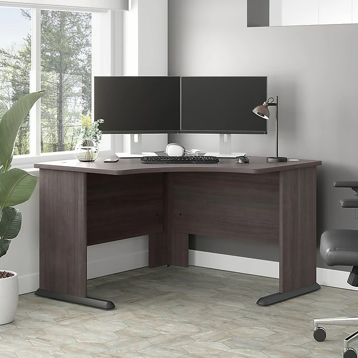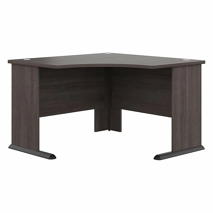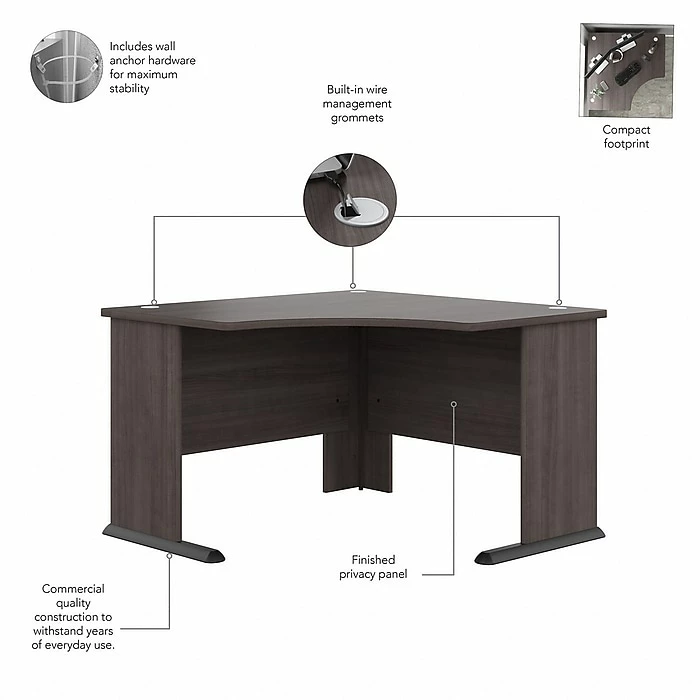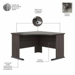 The Bush Business Furniture Studio A 48″W corner computer desk combines a fresh contemporary appearance with the commercial-quality construction needed to withstand years of everyday use. Conveniently designed to be placed in a corner of your choosing, this compact desk is a perfect choice for working or gaming where space is limited. Set up with a computer and equipment on the durable desktop that supports up to 200 lbs. Three built-in wire management grommets keep cords and cables in order, so the surface remains free from unnecessary clutter. Wall attachment hardware is included for maximum safety and security in any home or professional office. This small corner desk has been meticulously tested to meet or exceed the ANSI/BIFMA quality standards for safety, durability, and performance and is backed by a 10-year manufacturer warranty. American-made with US and imported parts.