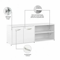 - Office credenza’s open and closed storage areas each contain one fixed shelf and one adjustable shelf to accommodate items of various sizes; mobile file cabinet includes two drawers