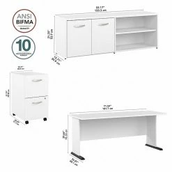 The Bush Business Furniture Studio A 72″W computer desk with mobile file cabinet and low storage cabinet combines a fresh contemporary appearance with the commercial-quality construction needed to withstand years of everyday use. Set up with a computer and equipment on the durable desktop that supports up to 200 lbs. and features three built-in wire management grommets. The rolling file cabinet’s lockable drawers open on smooth ball bearing slides for an effortless reach to letter-, legal-, and A4-size paperwork. The storage credenza’s open and closed compartments each include one fixed and one adjustable shelf to accommodate everything from reference materials to decorations. This large desk with storage has been meticulously tested to meet or exceed the ANSI/BIFMA standards for safety, durability, and performance and is backed by a 10-year warranty. American-made with US and imported parts.