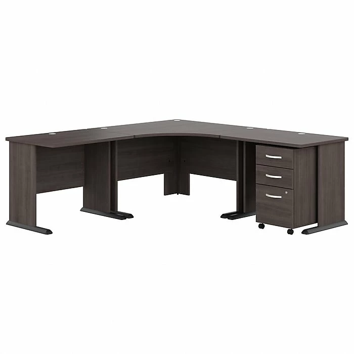 The Bush Business Furniture Studio A 83″W large corner desk with a three-drawer mobile file cabinet combines a fresh contemporary appearance with the commercial-quality construction needed to withstand years of everyday use. Set up with a computer and equipment on a durable thermally fused laminate desktop that supports up to 200 lbs. Five built-in wire management grommets keep cords and cables in order, so the surface remains free from clutter. The file cabinet’s bottom drawer accepts letter-, legal-, and A4-size paperwork, while a pair of box drawers organize supplies. The two bottom drawers can be locked to protect sensitive files and personal items. This corner computer desk with drawers has been meticulously tested to meet or exceed the ANSI/BIFMA standards for safety, durability, and performance and is backed by a 10-year manufacturer limited warranty. American-made with US and imported parts.