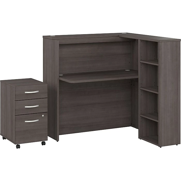 - Bundle includes: 48″W cubicle desk with shelves, three-drawer mobile file cabinet