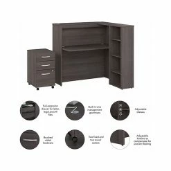 The Bush Business Furniture Studio C 48″W cubicle desk with shelves and mobile file cabinet is a great way to eliminate distractions and enhance productivity in any professional office. Tackle important projects from the comfort of a private workspace with panels that make it easy to stay focused on the task at hand. The 48″W desk’s durable work surface supports up to 200 lbs., and wire management grommets are included on the desktop, upper shelf, and side panel. The bookcase offers a perfect place to keep work materials and decorations. The locking file cabinet’s bottom drawer accepts letter-, legal-, and A4-size paperwork, while two box drawers organize supplies. This office cubicle desk with storage has been meticulously tested to meet or exceed the ANSI/BIFMA standards for safety, durability, and performance and is backed by a 10-year manufacturer warranty. American-made with US and imported parts.