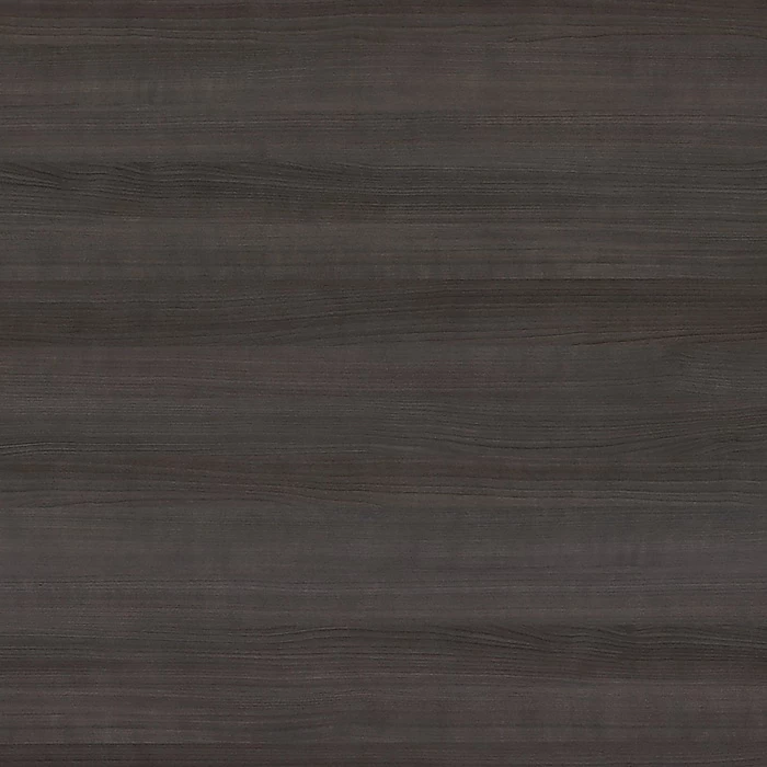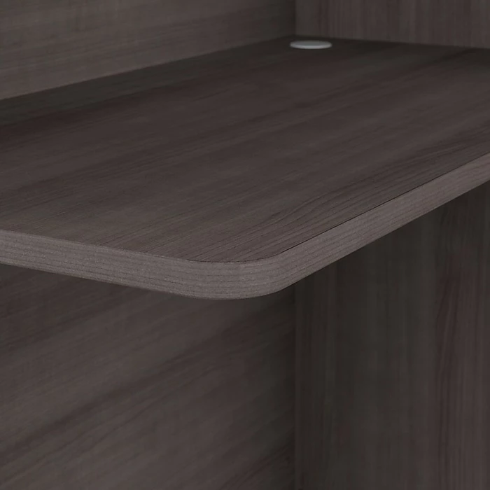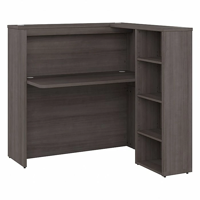 - Commercial desk and shelves are made of engineered wood in a storm gray laminate finish