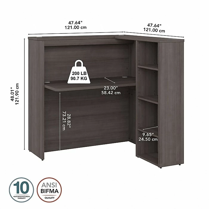 The Bush Business Furniture Studio C 48″W privacy desk with shelves offers a great solution for remote work professionals seeking to eliminate distractions in their home office. Tackle your next project from the comfort of a personal sanctuary with tall panels that make it easy to stay focused. The 48″W desk’s durable work surface supports a computer, books, and more with a weight capacity of 200 lbs. Powering equipment is simple thanks to wire management grommets on the desktop, upper shelf, and side panel. The four-shelf bookcase is perfect for keeping materials organized or for giving your workspace a personal touch with plants, pictures, and decorations. This home office desk with storage has been meticulously tested to meet or exceed the ANSI/BIFMA quality standards for safety, durability, and performance and is backed by a 10-year warranty. American-made with US and imported parts.