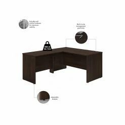 - Contemporary-style L-shaped desk surface offers space to spread out and integrated cable management to conceal computer cords