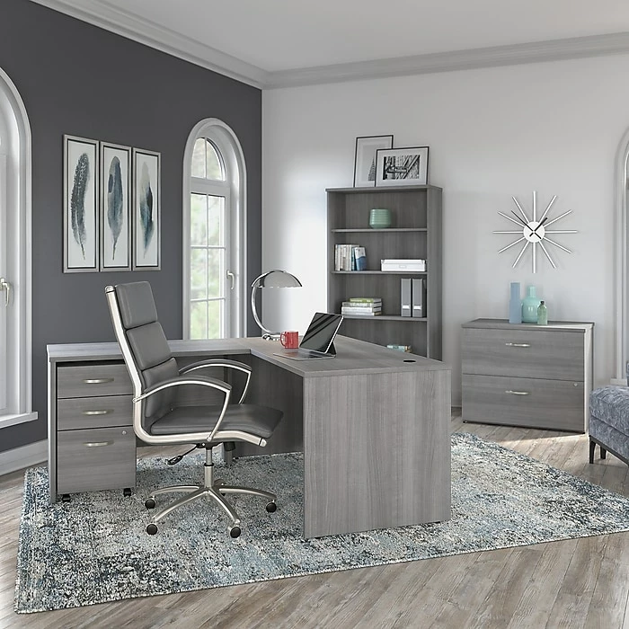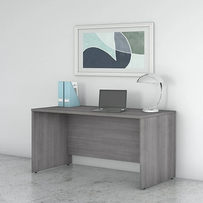The Bush Business Furniture Studio C office desk features a durable design, a spacious surface and a fresh finish for a contemporary, professional feel. Choose the Bush Business Furniture Studio C 60″W office desk for a durable design that works hard for years with a fresh finish that looks great anywhere. A thick surface, an extended modesty panel and clean lines convey a classic look. The thermally fused laminate finish, durable edge banding and sturdy end panels resist scratches, stains or dents while standing up to the rigors of a 40-plus-hour work week. Keep pesky computer cords out of your way with an integrated cable management system for an organized work surface. This computer desk is backed by a 10-year manufacturer limited warranty and meets ANSI/BIFMA quality test standards for safety and performance. See the full collection for coordinating items available to make your office your own with Studio C. American-made with US and imported parts.