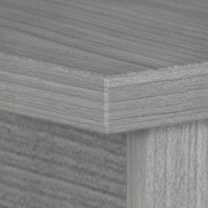- Thermally fused laminate over composite wood in a platinum gray finish