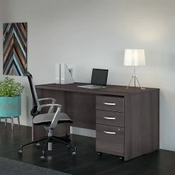 Choose the Bush Business Furniture Studio C 60W Office Desk for a durable design that works hard for years with a fresh finish that looks great anywhere. With a thick surface, an extended modesty panel and clean lines, the Office Desk conveys a classic look but adds a contemporary White or Storm Gray finish to meet the style needs of the modern workspace. The thermally fused laminate finish, durable edge banding and sturdy end panels resist scratches, stains or dents while standing up to the rigors of a 40-plus hour work week. Keep pesky computer cords out of your way with the cable management system for an organized work surface. Combine the Desk with matching products and accessories from the Studio C collection to create a unique office for the way you work. This contemporary office furniture comes with a 10 Year Warranty and meets ANSI/BIFMA quality test standards. See the full collection for coordinating items available to make your office your own with Studio C. American made with U.S. and imported parts.