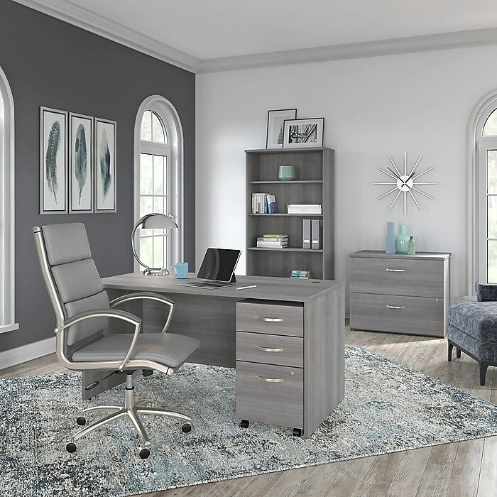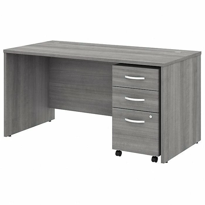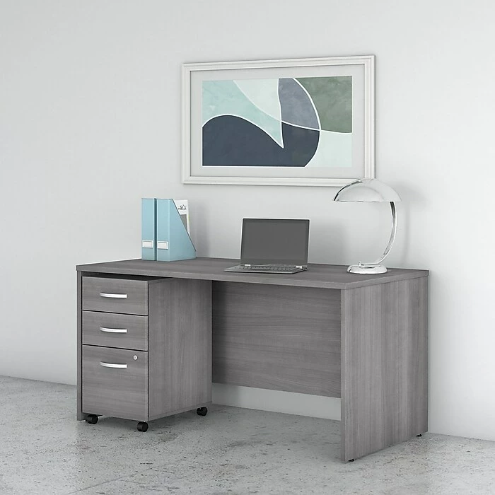 - Bundle includes: 59.43″W x 29.35″D office desk, three-drawer mobile file cabinet