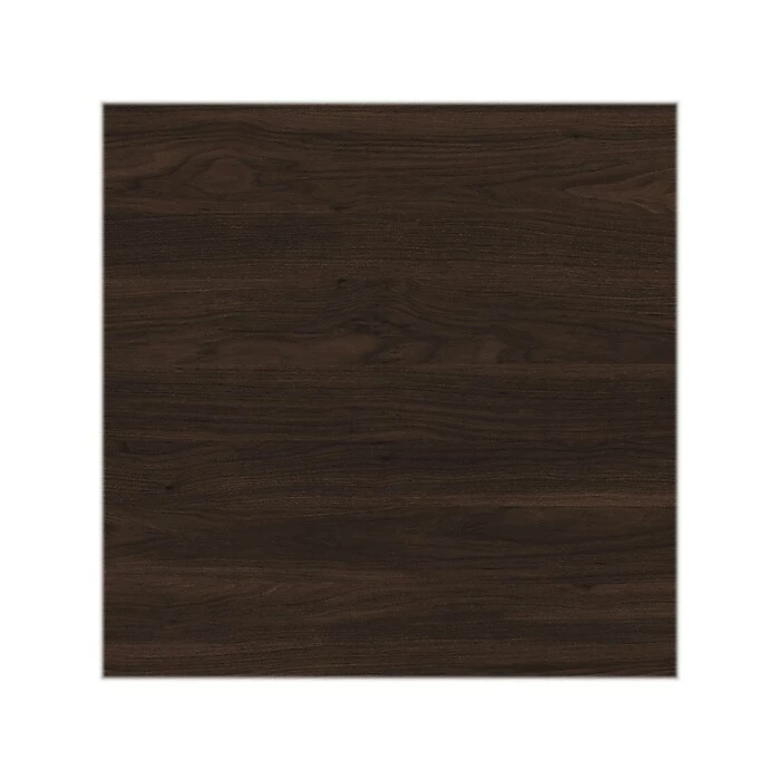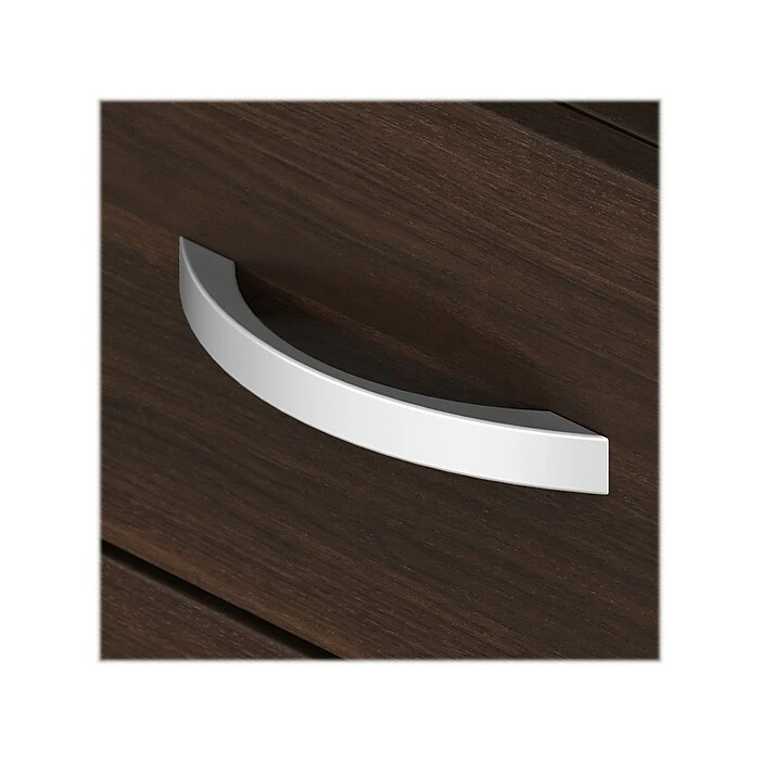 - Made of laminate over engineered wood and comes in black walnut finish with brushed nickel hardware