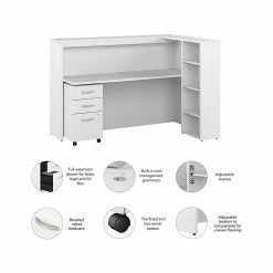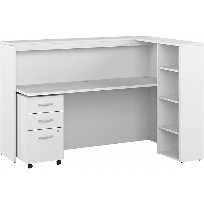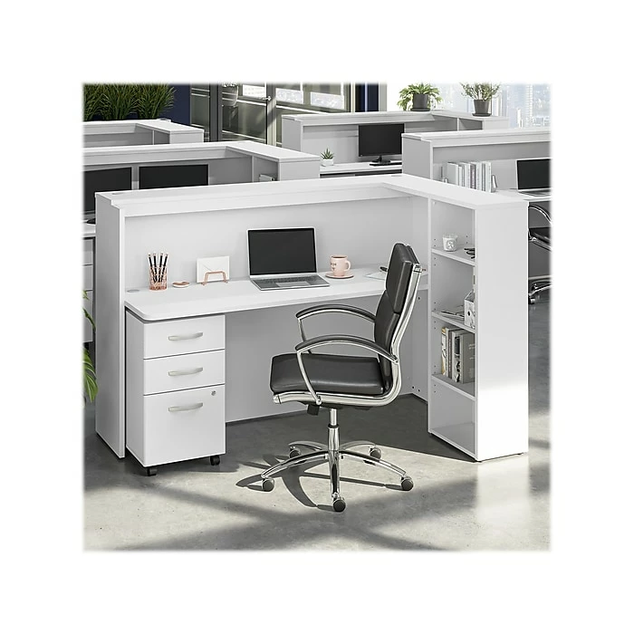 - Bundle includes: 72″W cubicle desk with shelves, three-drawer mobile file cabinet