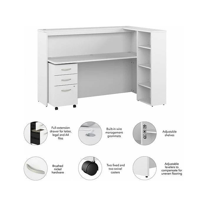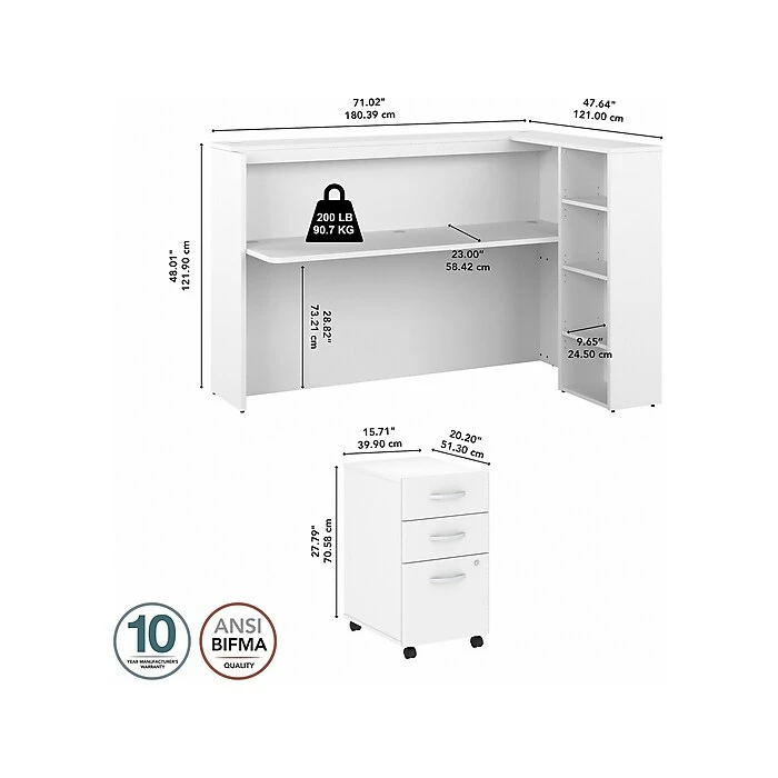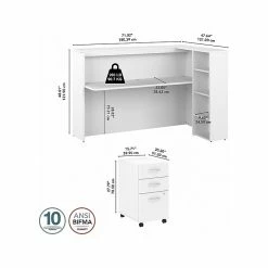 The Bush Business Furniture Studio C 72″W cubicle desk with shelves and mobile file cabinet is a great way to eliminate distractions and enhance productivity in any professional office. Tackle important projects from the comfort of a private workspace with panels that make it easy to stay focused on the task at hand. The 72″W desk’s durable work surface supports up to 200 lbs., and wire management grommets are included on the desktop, upper shelf, and side panel. The bookcase offers a perfect place to keep work materials and decorations. The locking file cabinet’s bottom drawer accepts letter-, legal-, and A4-size paperwork, while two box drawers organize supplies. This office cubicle desk with storage has been meticulously tested to meet or exceed the ANSI/BIFMA standards for safety, durability, and performance and is backed by a 10-year manufacturer warranty. American-made with US and imported parts.