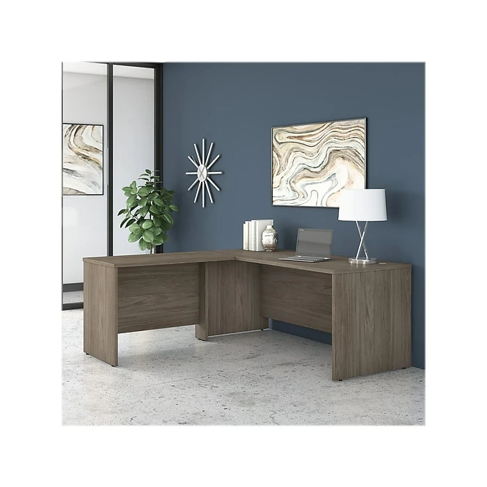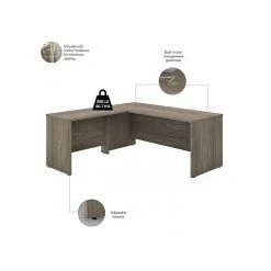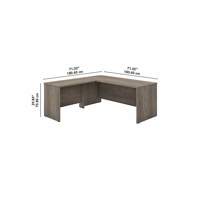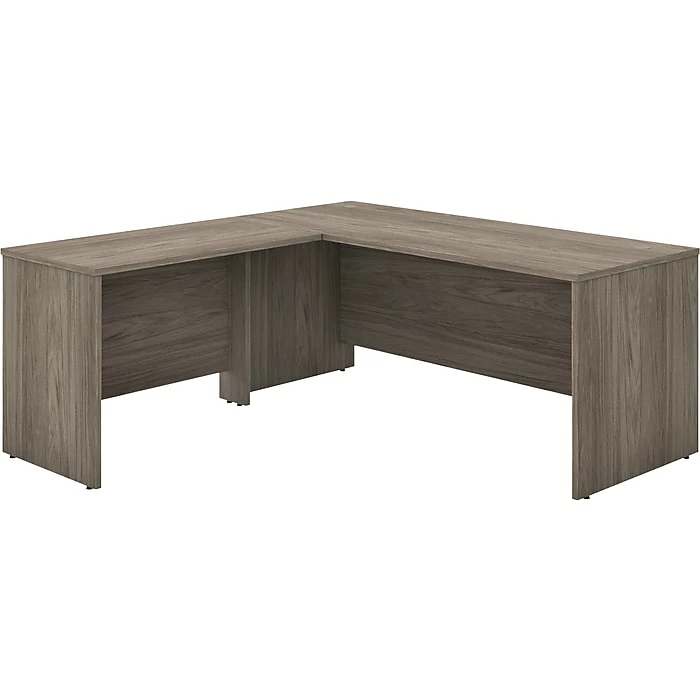 Highlighted by its contemporary style and commercial quality design, the Bush Business Furniture Studio C 72″W L-shaped desk with 42″W return presents a great workspace for a modern professional. Take advantage of the spacious surface to spread out with a computer, paperwork, and more as you tackle your next big project. The L-shaped desktop easily accommodates multiple monitors and other materials with a 200 lb. weight capacity and built-in wire management grommets. Position the L-shaped desk in a corner to save space in a small private office, or make use of the finished back to face outward in an open-plan environment. The return can be installed on either side of the main work surface for a right- or left-handed configuration. This corner desk is tested to meet ANSI/BIFMA standards for safety and performance and is backed by a 10-year manufacturer limited warranty. American-made with US and imported parts.