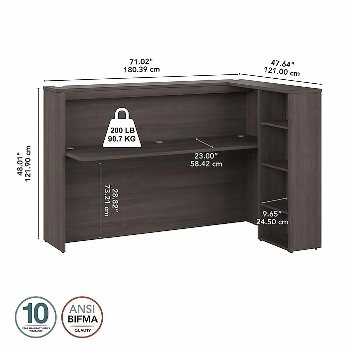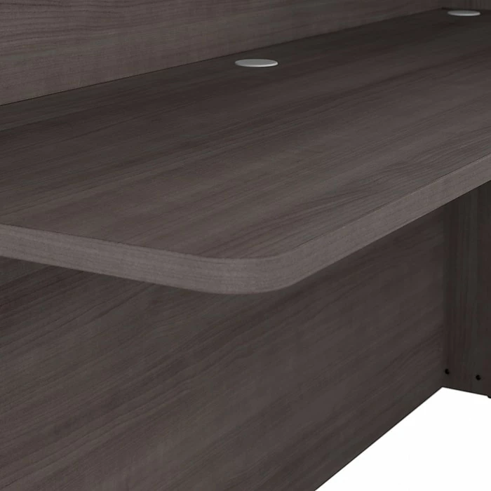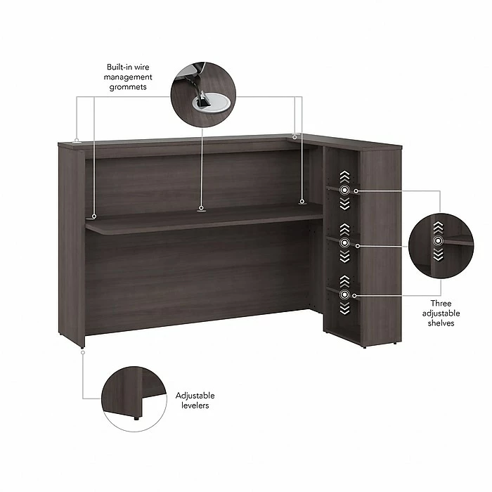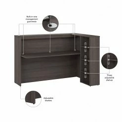 - Commercial desk and shelves are made of engineered wood in a storm gray laminate finish